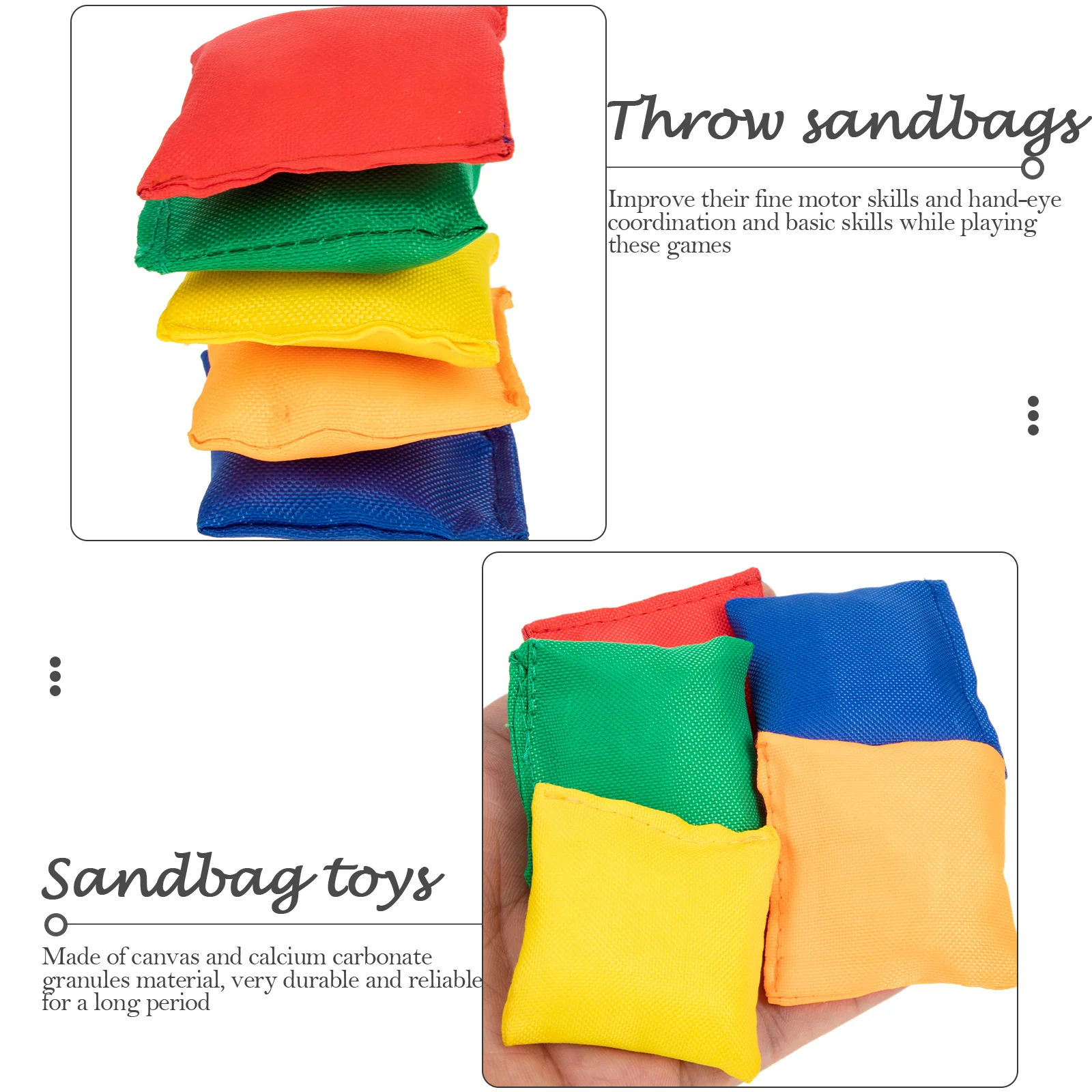 ��Made of canvas and calcium carbonate granules material, very and for a period.|��Improve their fine motor skills and hand- eye coordination and basic skills while playing these games.|��You can exercise the control of strength and angle while throwing sandbags, and experience the fun of sports.|��It is a fun game for friends and family at parties, picnics, campgrounds and other outdoor recreation.|��A wonderful toy allowing your kids and their friends to play happily, which will bring your kids lots of fun.