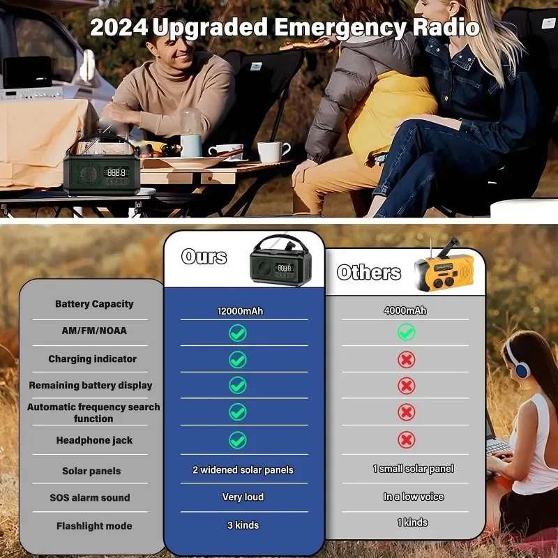 A Powerful and Multi-functional Weather Radio: Real-time weather updates & emergency broadcasts, Flashlight/Reading Light, AM/FM/WB NOAA,12000mAh Large Battery Capacity, SOS alarm, Dual solar panels, Up to 108-hour battery life, USB charging & hand crank, Your essential companion for any situation.