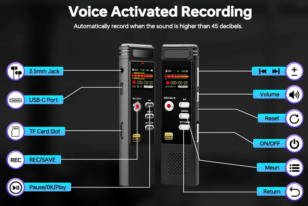 Turn on the voice activated function, the recorder will auto record once the voice reach correct voice decibel level, and stop recording when there is no sound. It greatly saves the memory space and listening time, and widely used in classroom and language learning.