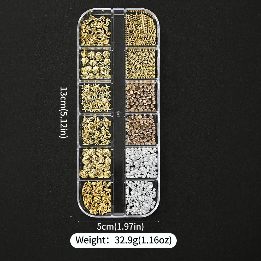 12Grids Ocean Gold Nail Art Charms Shell/Seahorse/Starfish White Half Round Pearl Gems 3D Mixed Punk Manicure Metal Rivets Studs