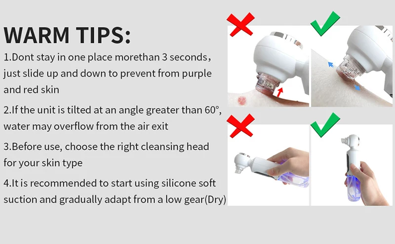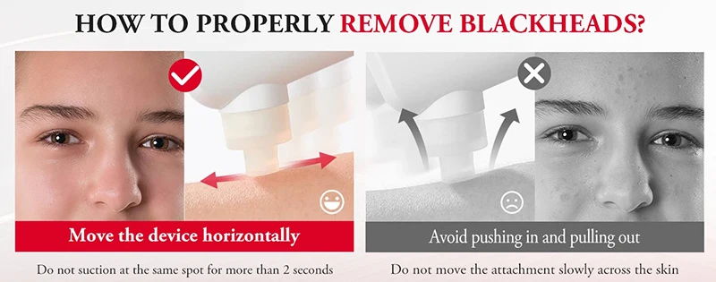 Three kinds of suction heads are suitable for different facial skin conditions, . Small suction heads are suitable for small areas, such as the corner of the nose. Medium suction heads are suitable for around the eyes, nose and large suction heads are suitable for forehead and face.We recommend that first-time users start with low suction and soft silicone suction