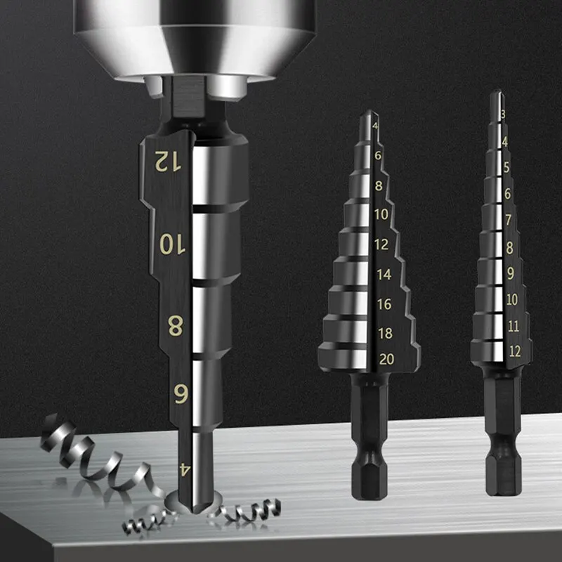3Pcs HSS Straight Groove Step Drill Bit 3-12mm 4-12mm 4-20mm Nitride Black Hex Wood Metal Hole Cutter Core Drilling Tools Set