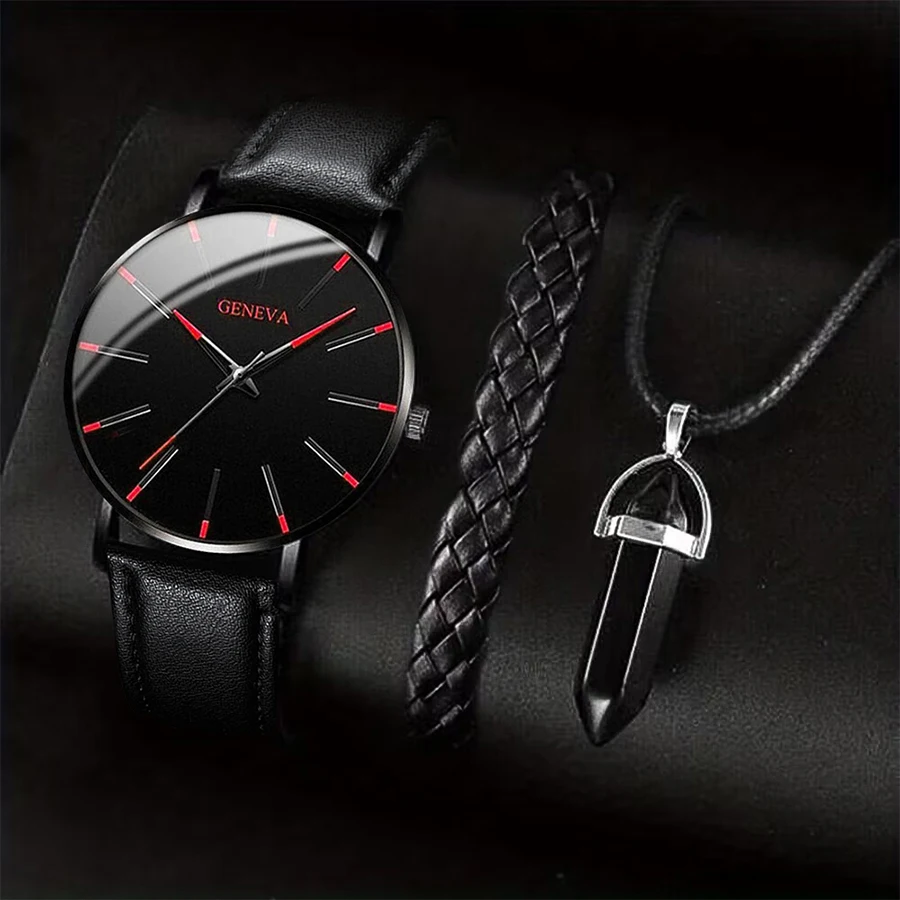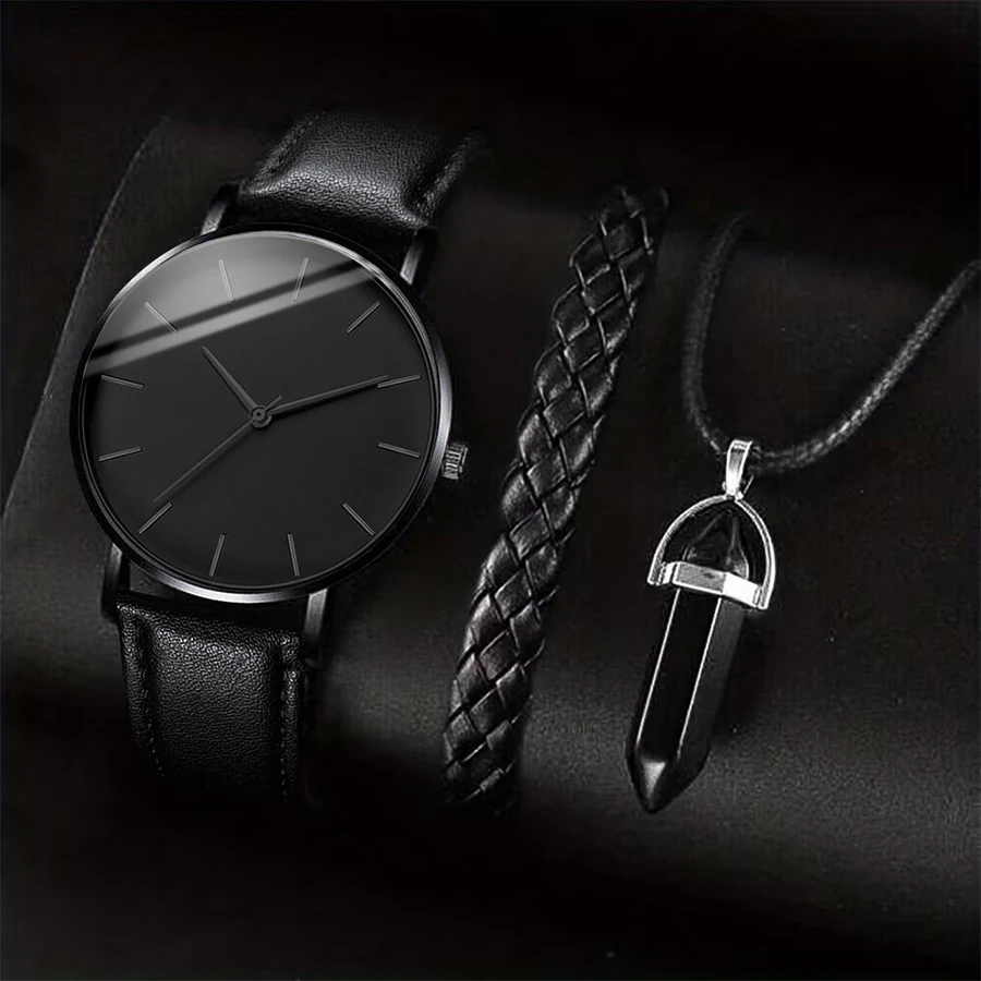 3PCS/Set Men Business Watches Casual Leather Band Analog Male’s Quartz Watch Necklace Bracelet Set