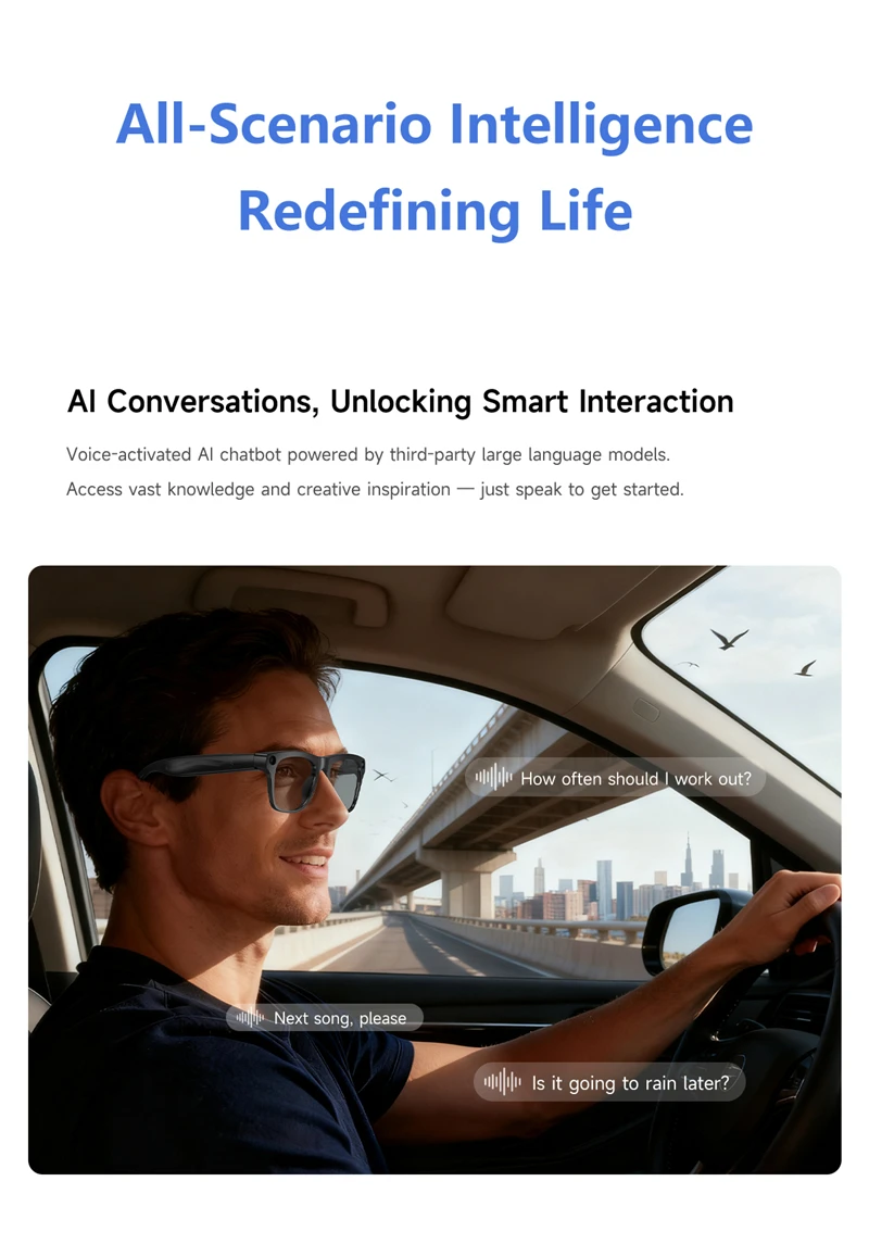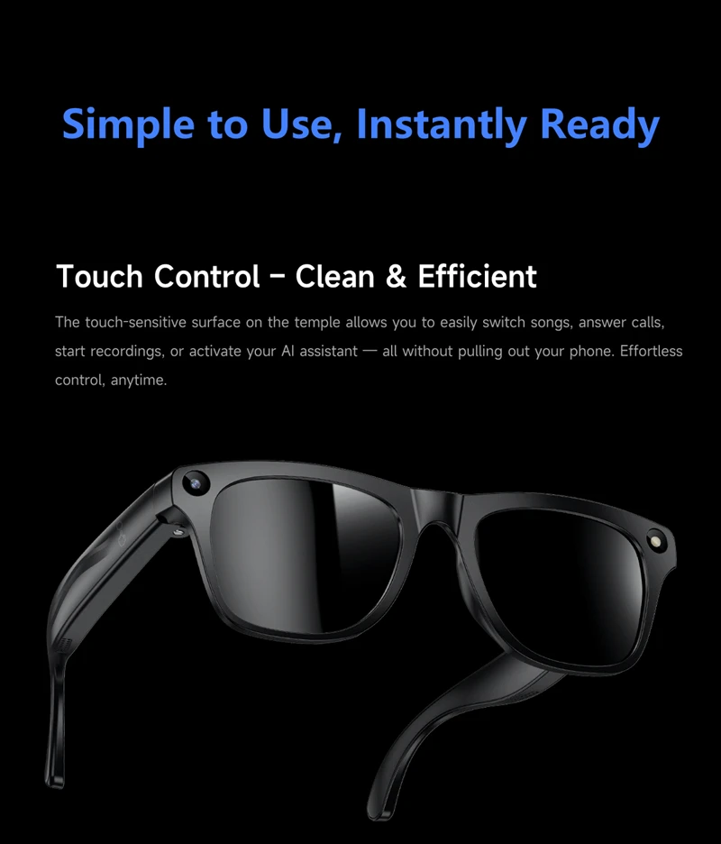 Main features: AI voice assistant/photographyaudio recording/music control/call/alarm sounds/light headlights/translation/object recognition/touch screen/music playback (music control, local music) etc.