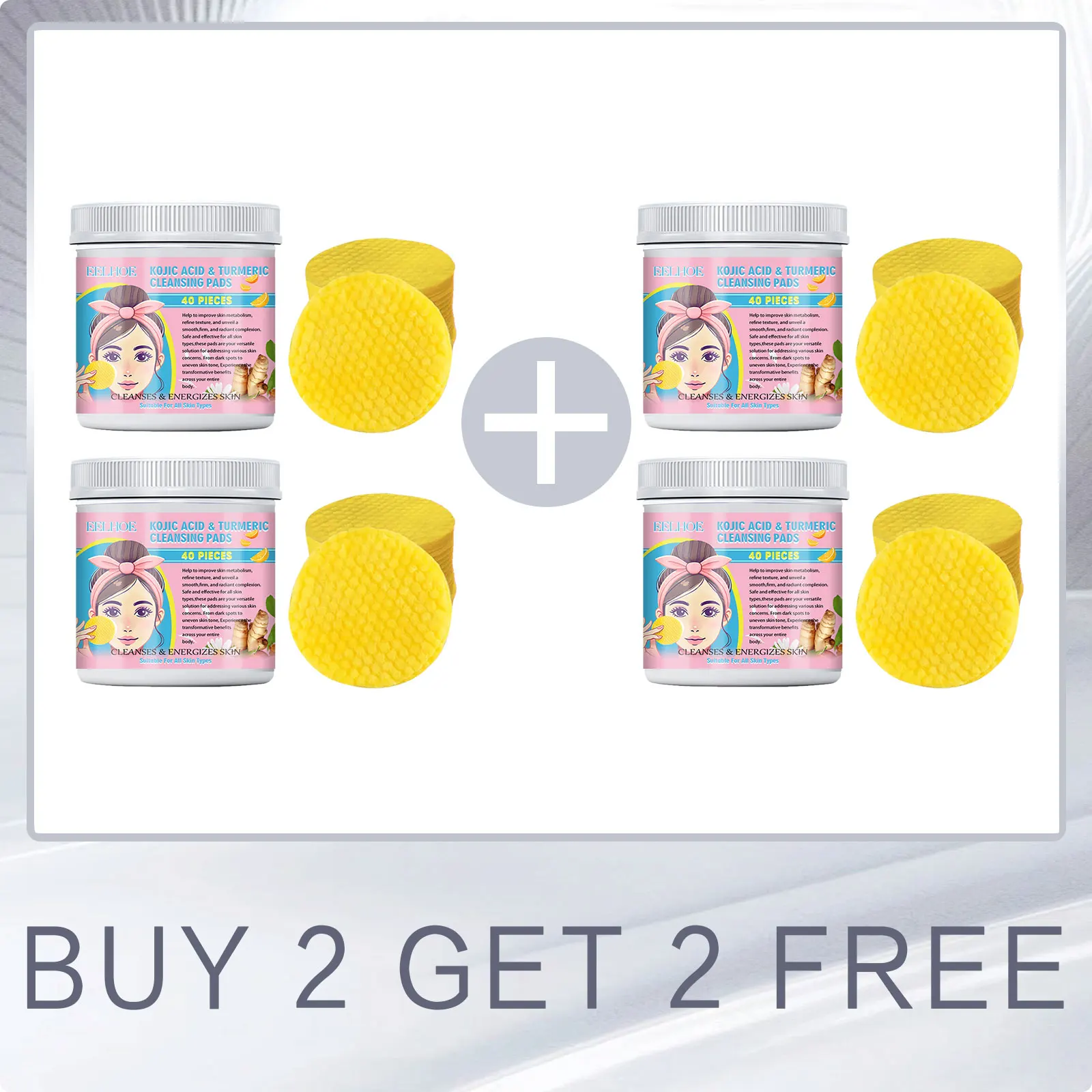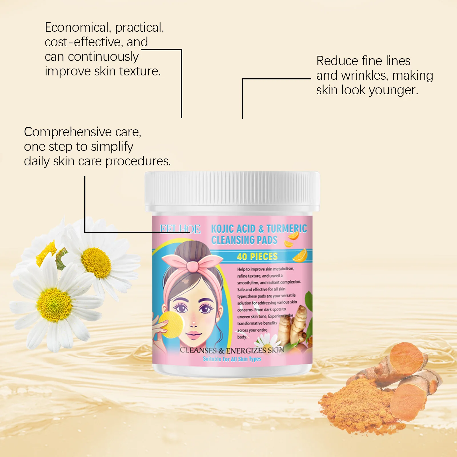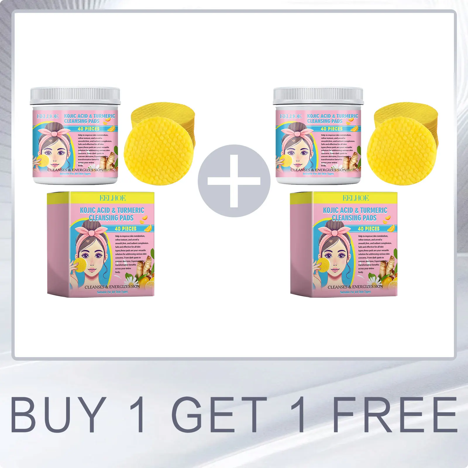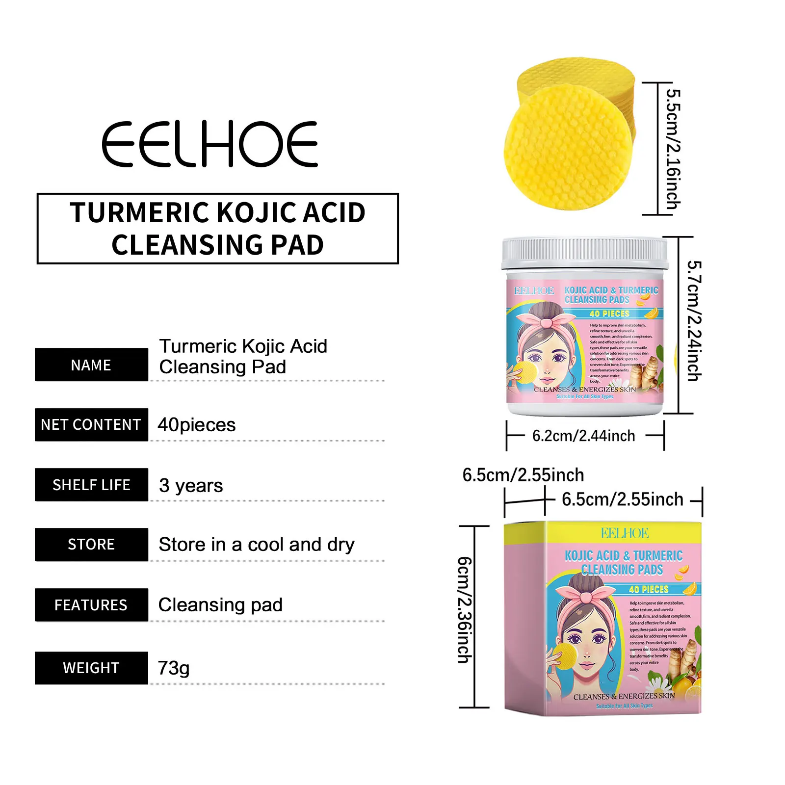 EELHOE Turmeric Kojic Acid Facial Cleansing Pads Cleaning Remover Pores Dirt Moisturizer Face Exfoliating Daily Clean Skin Care 40pcs