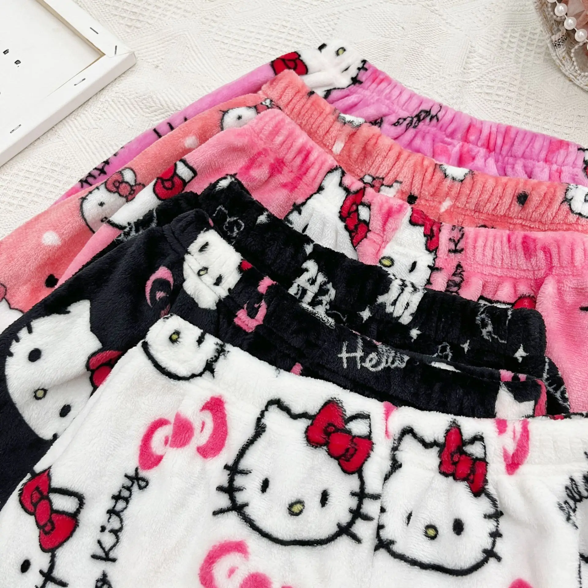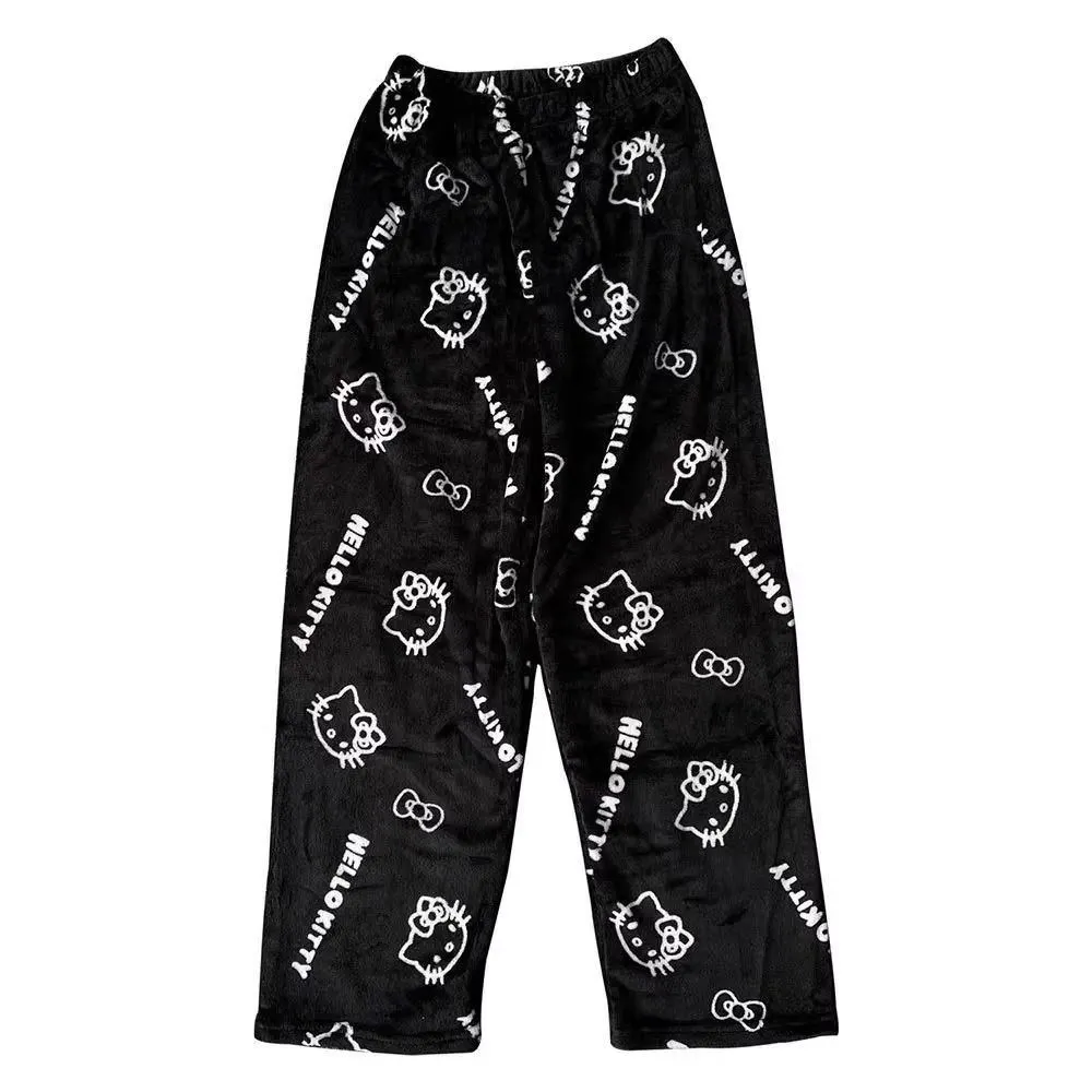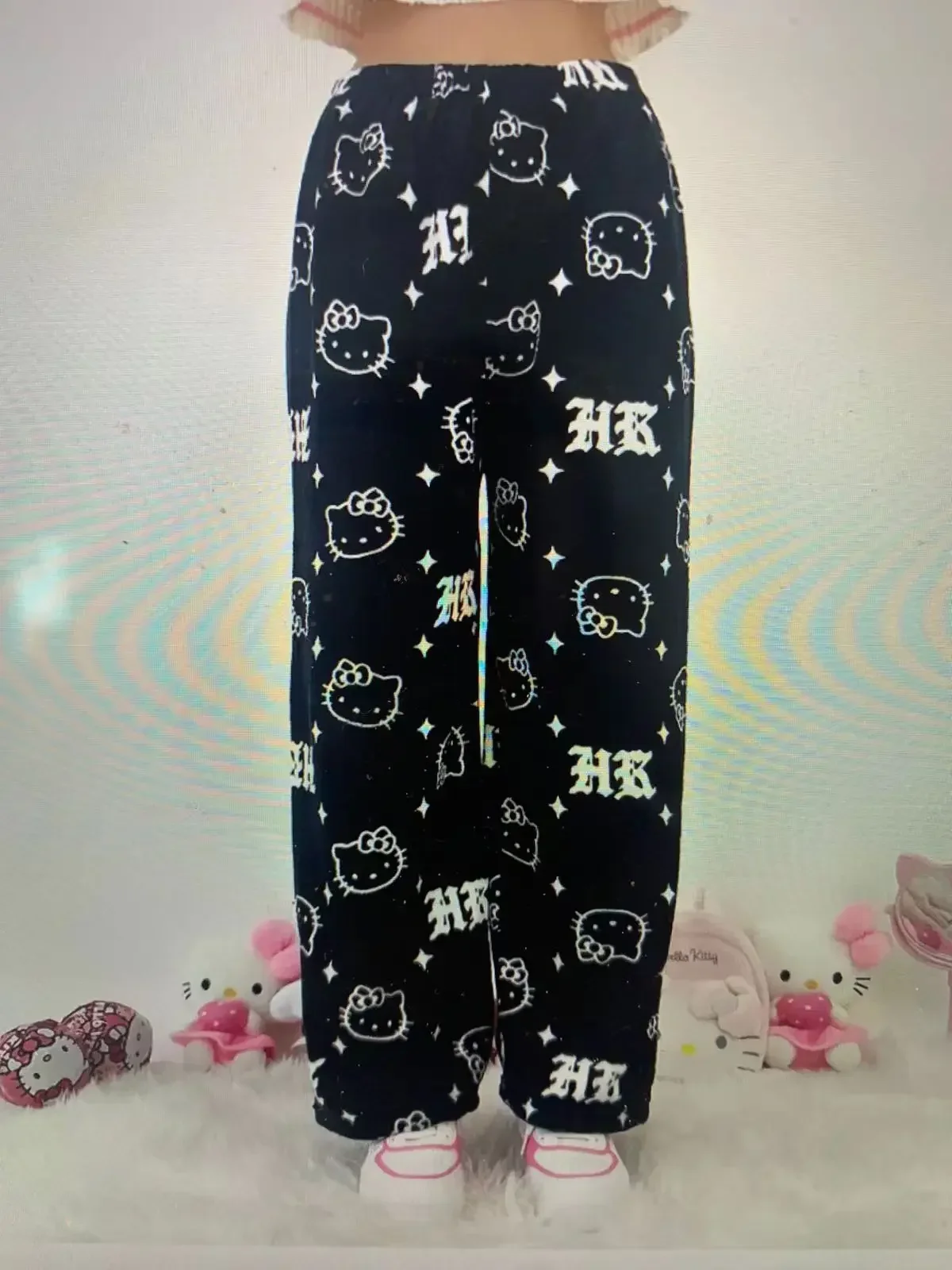 Halloween Cartoon Hello Kitty Flannel Pajamas Women’s Autumn and Winter Plus Velvet Warm Casual Home Graffiti Pants
