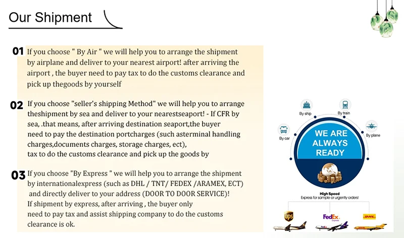 we will help you to arrange the shipment by international express (such as DHL / TNT/ FEDEX /ARAMEX, ECT) and directly deliver to your address (DOOR TO DOOR SERVICE)!