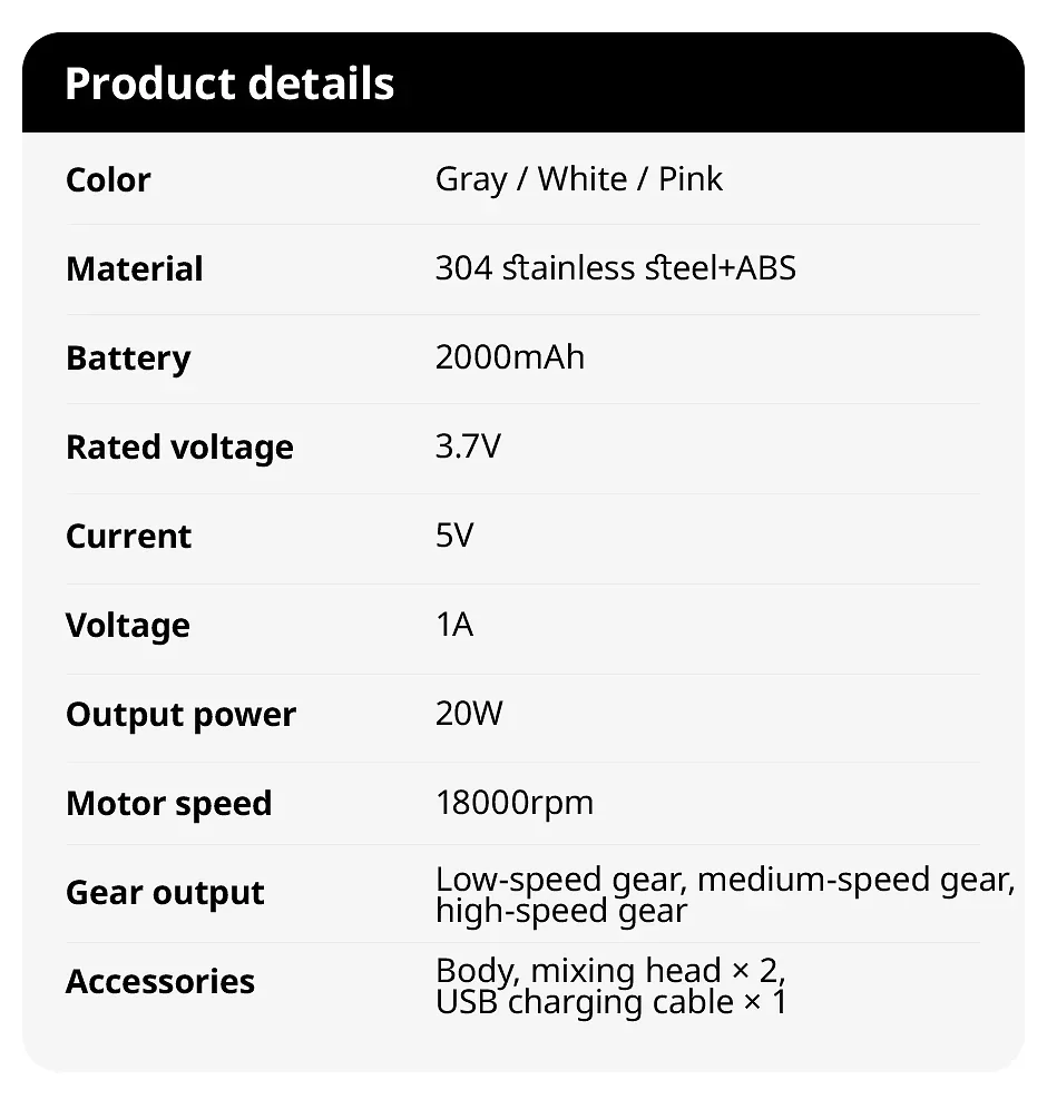 Color box package 1, egg beater body 1, mixing head 2, data cable 1