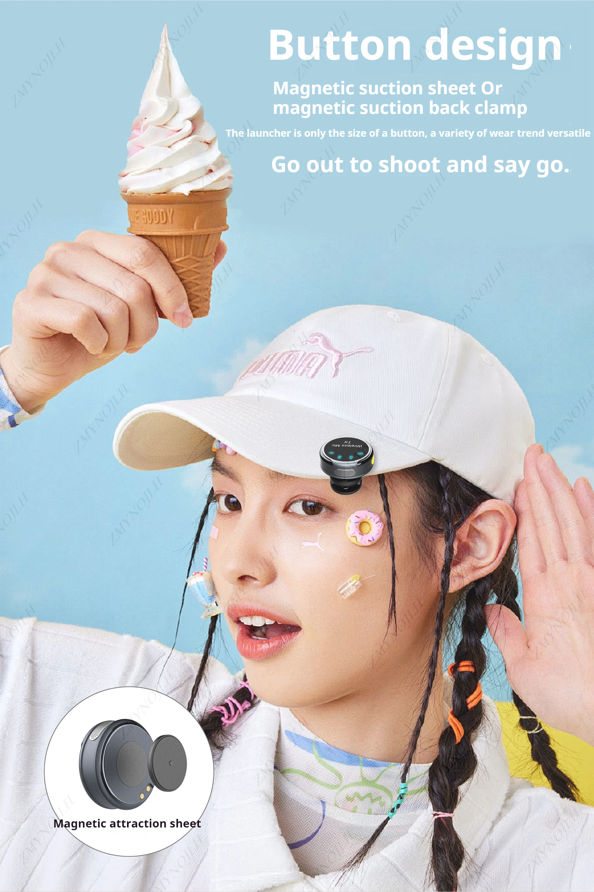A unique feature of this wireless microphone is that it can be easily fixed on clothing or hats, providing users with a more stable and accurate recording experience. Specifically, the design utilizes magnetism, with magnetic parts on the microphone that adhere to specific buttons or other magnetic objects to hold the microphone in place.
