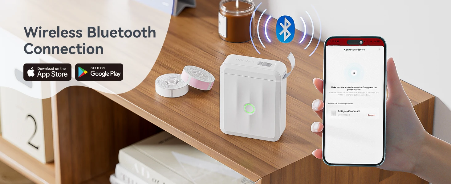 This mini Bluetooth label printer prints stickers wirelessly. Download the NIIMBOT app, and then connect and pair the Bluetooth via the app. The app included more than 60 +Fonts, 12+Languages, and 400+ Borders.