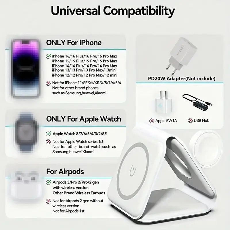 Compatible with major Apple devices and wireless headphones, supports other mobile phones with wireless charging functionality.