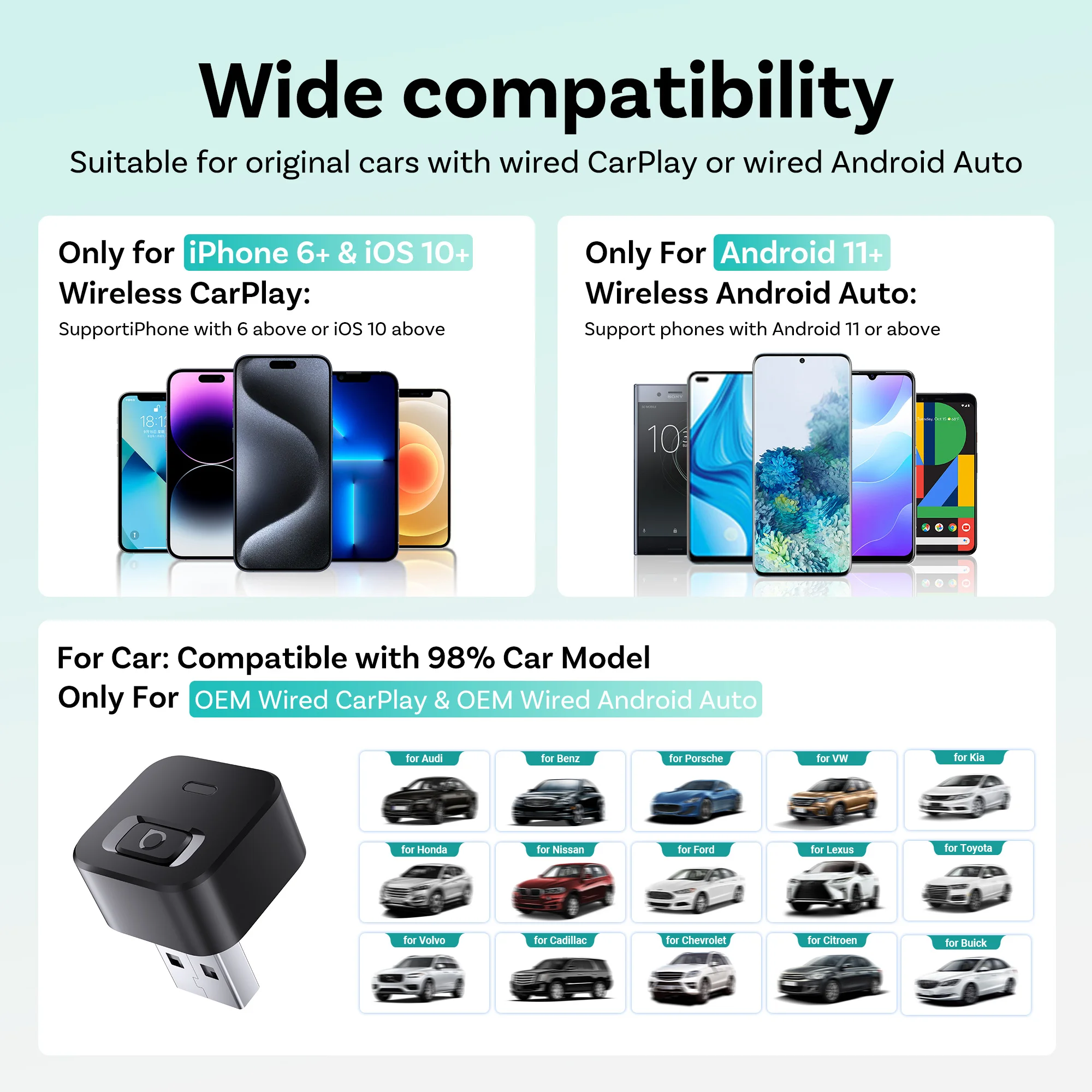 Our wireless CarPlay adapter is a 2 in 1 wireless adapter, so you never have to swap devices. Whether you drive with an i Phone, Sam ung, or any other Android phone, one adapter has you covered—perfect for households with mixed phones and seamless source switching.