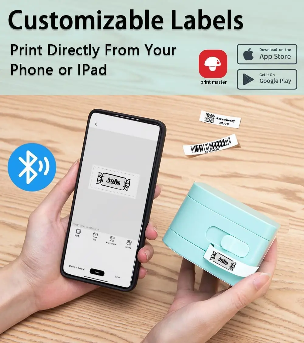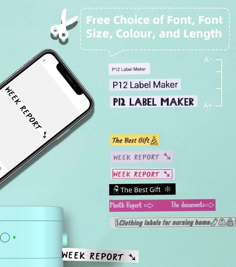 Lable maker not only supports plastic, paper labels but also satin ribbon and iron-on labels. Choose from 154 fonts, over 78 frames and thousands of icons, edit with your phone by the app "Print Master", P12-PRO label maker machine with tape is a great help to keep your household & office organized.