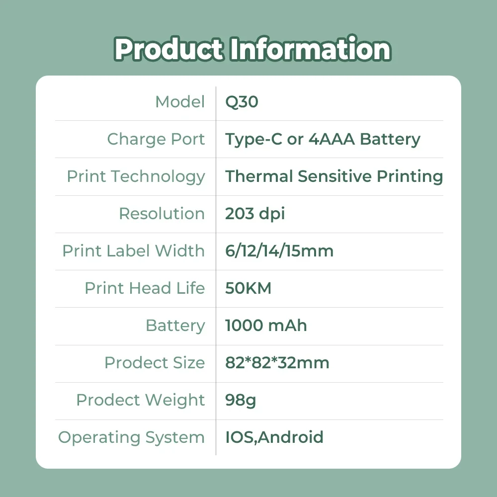 [Simple but Practical] – The Q30 mini label printer supports 6mm/12mm/14mm/15mm 4 specifications of printing paper, which can be applied to different items. In addition, please look for the Q30 exclusive label tape, which is waterproof and oil-proof, Clearer text, and can be easily torn off without residue.