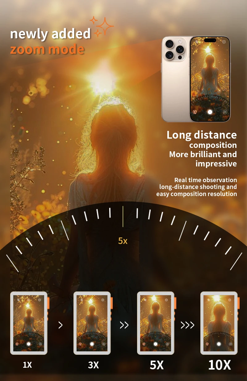 * Adjustable focal length: New zoom mode, support 3X, 5X, 10X zoom, rear camera telephoto selfie, long-distance 20~50 meters composition, real-time observation of long-distance shooting composition is easily solved, more colorful and more film.