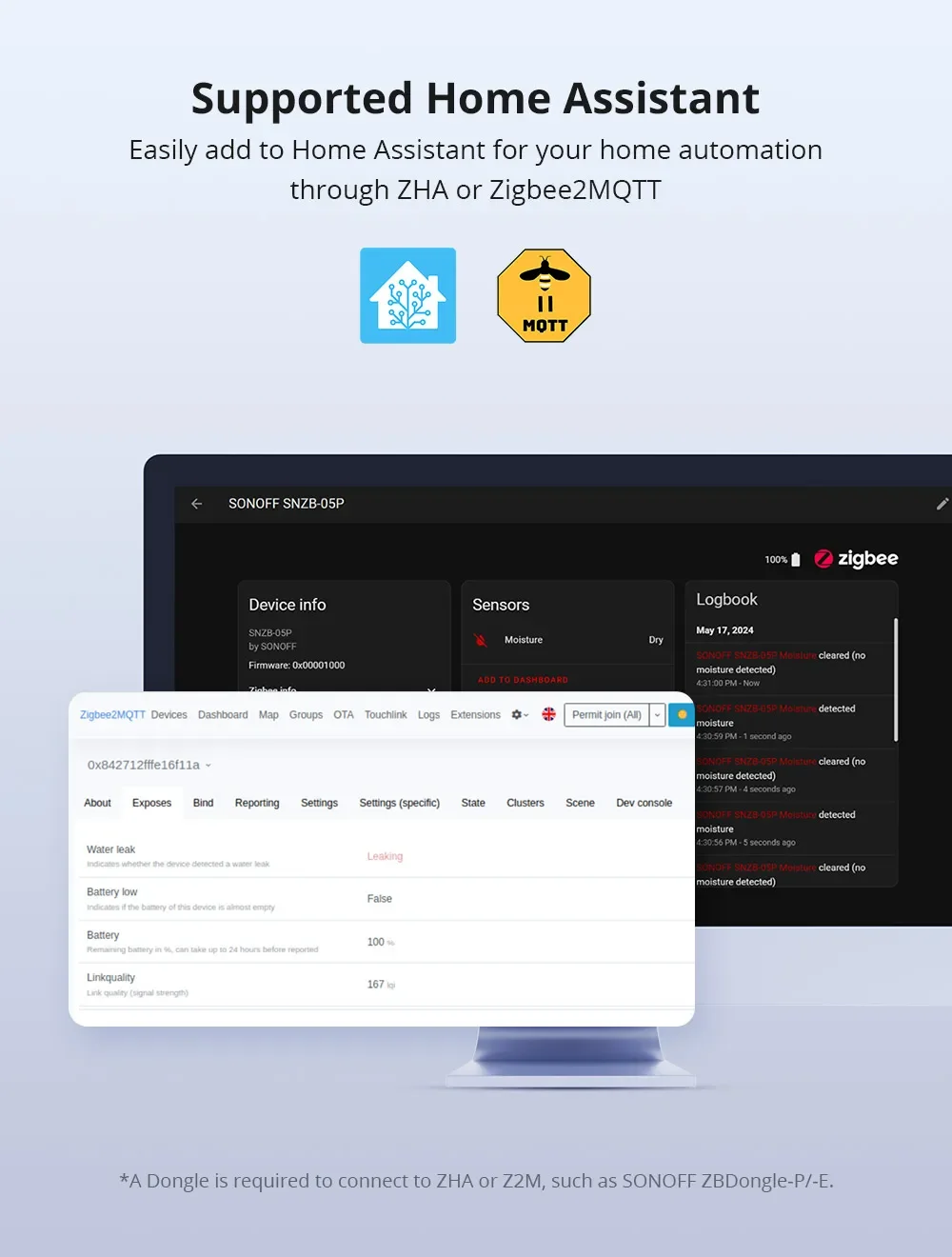 【Support Home Assistant】Easily add to Home Assistant for your home automation through ZHA or Zigbee2MQTT( Zigbee Dongle is required, e.g. SONOFF ZBDongle-P/ ZBDongle-E).
