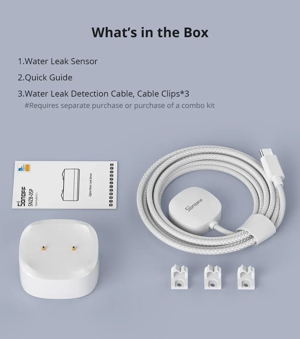 SNZB-05P is a low-power water leak sensor utilizing the Zigbee 3.0 protocol to detect real-time water leakage in the environment. The SNZB-05P has multiple detection methods for various scenarios. The elevated probe design can detect a 0.5mm liquid level and allows for use on metal surfaces without false triggers from the metal, which can be used for leaking detection. The concave water collection design detects drips and stops leaks at the source which can be used for the dripping detection. Used with water leak detection cable(separate purchase or purchase sensor kit), whether it's wide-range detection or narrow-area inspection, ideal for monitoring basements, laundry rooms, and under sinks. The extension cable can be connected in series without any limit on the total length.