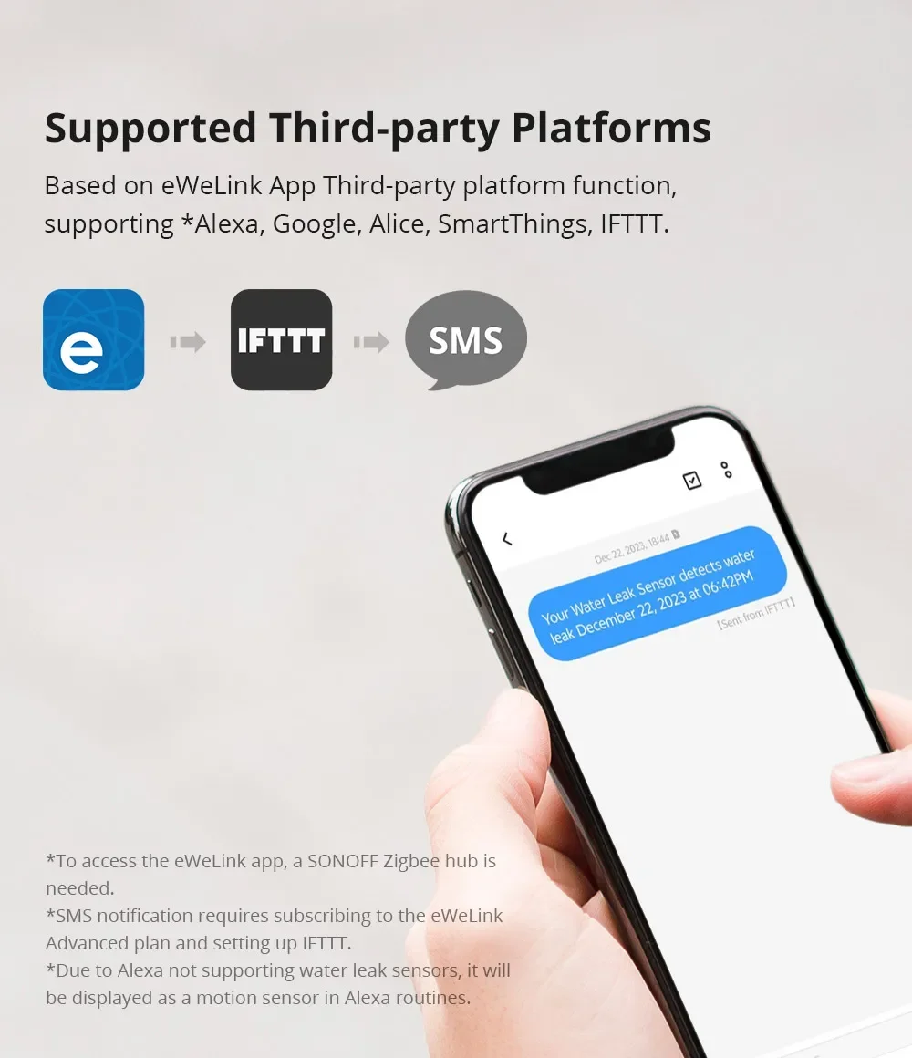 Water damage often goes unnoticed until it's too late. With the SONOFF SNZB-05P, you'll receive app push notifications to your phone when water leakage occurs. Zigbee local scenes can trigger the gateway's sound alarm even if the WiFi network fails. It also supports Email alerts (with eWeLink advanced plan) and SMS notifications (with eWeLink advanced plan, and setting up IFTTT). Multiple notifications allow you to take swift action to prevent costly damage and mold growth. The sensor sends alerts every ten minutes during water leakage events to prevent missed notifications due to network fluctuations, ensuring your property's safety.