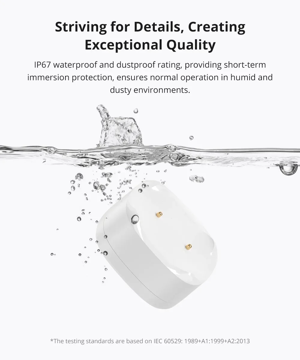 Powered by a CR2477 battery, the SNZB-05P offers over 5 years of use, eliminating concerns about frequent battery replacements. It has an IP67 waterproof and dustproof rating, providing short-term immersion protection and ensuring reliable operation in humid and dusty environments. The sensor is equipped with gold-plated probes for enhanced corrosion resistance and made from UV-resistant materials to prevent discoloration over time.