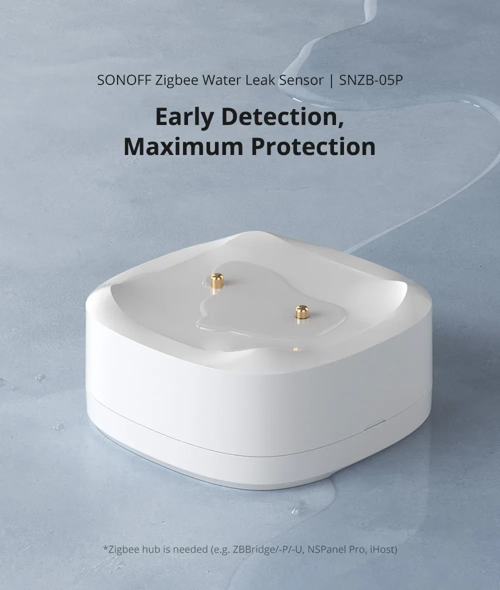 SNZB-05P water leak sensor integrates with Zigbee hubs utilizing the Zigbee 3.0 protocol, such as SONOFF NSPanel Pro, SONOFF iHost, SONOFF ZB Bridge/ZB Bridge-P/ZB Bridge-U, SmartThings hub v3…
