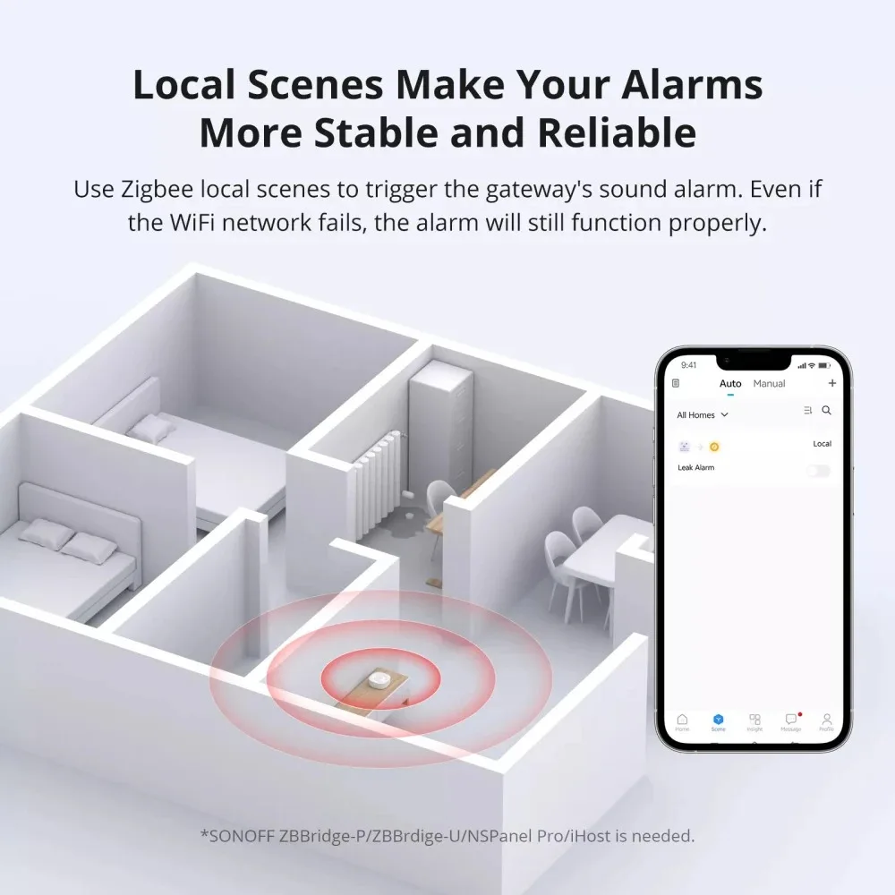 【Real-time Alerts & Multiple Notifications】SNZB-05P water leak sensor will instantly send app push notifications to your phone when water leakage occurs. Zigbee local scenes can trigger the gateway's sound alarm even if the WiFi network fails.