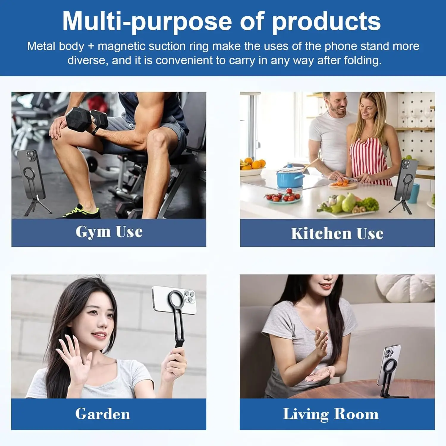 【Portable and Universal Design】With its foldable and pocket-sized structure, this Magnetic Pocket Phone Tripod is exceptionally travel-friendly. Lightweight and compatible with all phone models, it comes with a dedicated magnetic ring that secures your device, ensuring stability even during action shots—perfect for enhancing your mobile photography experience on the go.