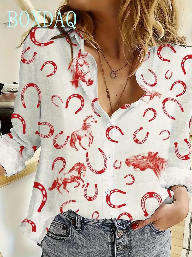 Women Fashion Print Long Sleeve Shirts Cute Animals Horse Print Blouses Tops Spring Summer 2025 Streetwear Clothing Casual Shirt